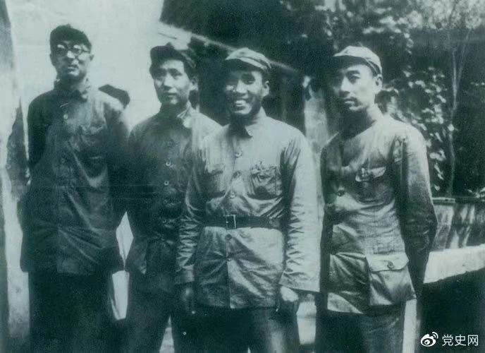 ▲1937年8月22日至25日,中共中央在陜北洛川馮家村舉行政治局?jǐn)U大會(huì)議(即洛川會(huì)議)。圖為毛澤東和朱德、周恩來、林伯渠的合影。
